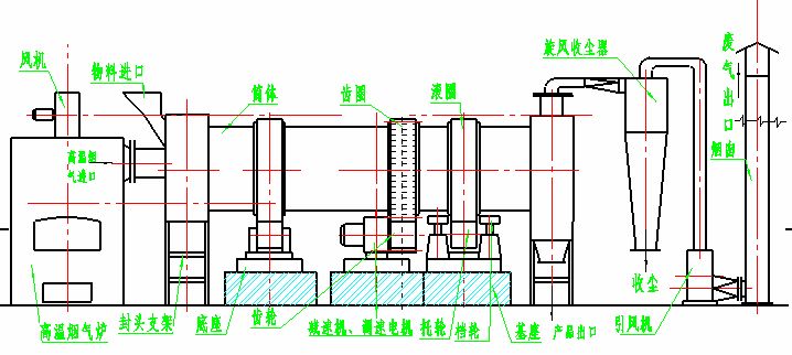 干燥的濕物料由皮帶輸送機(jī)或斗式提升機(jī)送到料斗,然后經(jīng)料斗的加料機(jī)通過加料管道進(jìn)入加料端。加料管道的斜度要大于物料的自然傾角,以便物料順利流入干燥器內(nèi)。干燥器圓筒是一個(gè)與水平線略成傾斜的旋轉(zhuǎn)圓筒。物料從較高一端加入,載熱體由低端進(jìn)入,與物料成逆流接觸,也有載熱體和物料一起并流進(jìn)入筒體的。隨著圓筒的轉(zhuǎn)動物料受重力作用運(yùn)行到較底的一端。濕物料在筒體內(nèi)向前移動過程中,直接或間接了載熱體的給熱,使?jié)裎锪系靡愿稍?,然后在出料端?jīng)皮帶機(jī)或螺旋輸送機(jī)送出。在筒體內(nèi)壁上裝有抄板,它的作用是把物料抄起來又撒下,使物料與氣流的接觸表面增大,以提高干燥速率并促進(jìn)物料前進(jìn)。載熱體一般分為熱空氣、煙道氣等。載熱體經(jīng)干燥器以后,一般需要旋風(fēng)除塵器將氣體內(nèi)所帶物料捕集下來。如需進(jìn)一步減少尾氣含塵量,還應(yīng)經(jīng)過袋式除塵器或濕法除塵器后再放排放。